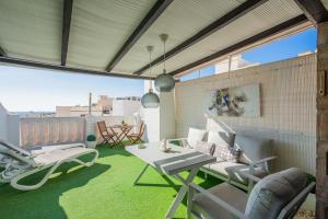 Questo appartamento presenta 1 camera da letto, 1 bagno, lenzuola, asciugamani, una TV a schermo piatto con canali via cavo, una zona pranzo, una cucina con utensili e una terrazza con vista sulla città.