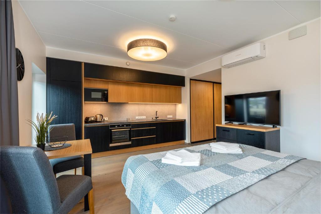 Apartament oferuje 1 sypialnię, kuchnię z lodówką i zmywarką oraz 1 łazienkę z prysznicem, suszarką i pralką. Ręczniki i pościel są dostępne w apartamencie TartuKodu Riia 20B-13.