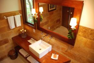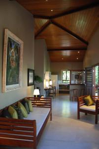 Krásné chaty Terra Dos Goitis - Chalés - Pipa se vyznačují příjemnou kombinací barev, moderního nábytku a klasických prvků. Mají manželskou postel King ve stylu nebes a prostorný obývací pokoj s výhledem do zahrady. K dispozici je plazmová TV, minibar, telefon a houpací síť.