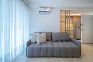 Klimatizovaný apartmán v Terrazzo 408A - Apartamento 02 quartos - Acomoda até 05 pessoas - À poucos metros da praia de Bombas - (Consultar serviços de roupa de cama e banho) má 2 ložnice, 2 koupelny a kuchyň s troubou a lednicí. Apartmán Terrazzo 408A - Apartamento 02 quartos - Acomoda até 05 pessoas - À poucos metros da praia de Bombas - (Consultar serviços de roupa de cama e banho) nabízí posezení a koupelnu.