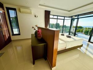 La villa climatizzata di The Carma - stylish and luxury sea view pool villa presenta 4 camere da letto, soggiorno, cucina attrezzata con frigo e macchina da caffè, e 4 bagni con bidet e doccia. Lenzuola e asciugamani sono forniti presso la struttura.