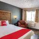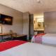 A cable TV is featured in this room. A small fridge is also included.