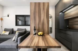 Diese Ferienwohnung mit Klimaanlage ist ausgestattet mit 1 Schlafzimmer, Flachbild-TV, einem Essbereich und einer Küche mit einem Kühlschrank und einem Ofen.