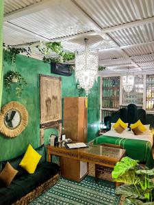 This room has a lounge area with a fireplace and is decorated in rich reds and mauves, featuring silk, velvet and Arabian lamps. The en suite, tadelakt bathroom has a bath-for-two with a shower and an antique brass washbasin.