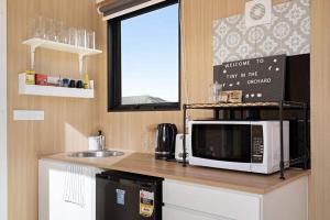 Cette maison de vacances avec climatisation se compose de 1 chambre séparée, d'une cuisine entièrement équipée avec un réfrigérateur et un micro-ondes, ainsi que de 1 salle de bains. Le linge de lit et les serviettes sont fournis par Tiny in the Orchard by Tiny Away.