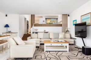 The air-conditioned holiday home has 4 bedrooms and 2 bathrooms with a bath and a shower. Meals can be prepared in the well-fitted kitchen, which features a refrigerator, a dishwasher, kitchenware and an oven. Among the room amenities are a washing machine, a tea and coffee maker and a seating area as well as sea views. The unit has 7 beds.