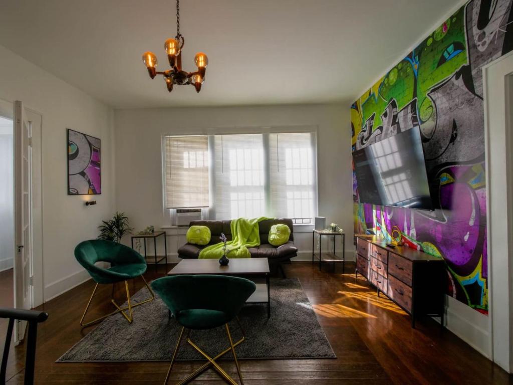 Klimatizovaný apartmán v Unique Stylish 2-Bedroom Apt Miami Getaway má 2 ložnice, 1 koupelnu a plně vybavenou kuchyň. Apartmán má také koupelnu.