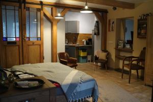 Das Apartment Urlaub im Friseursalon bietet 1 Schlafzimmer, 1 Bad, Bettwäsche, Handtücher, Flachbild-TV, Essbereich, Küche und eine Terrasse mit Gartenblick.