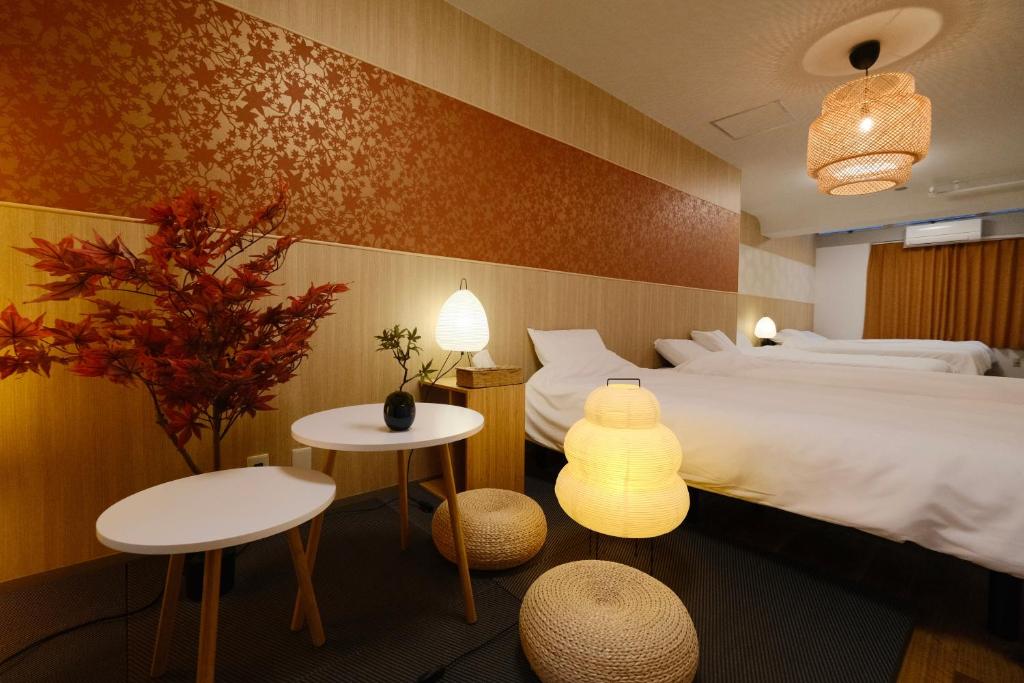 This air-conditioned apartment consists of 1 living room, 1 separate bedroom and 1 bathroom with a bath. The fully equipped kitchen has a stovetop, a refrigerator, kitchenware and a microwave. The apartment features tatami floors, a seating area with a flat-screen TV with streaming services, a washing machine, a dining area, as well as an electric kettle. The unit offers 5 beds and 2 futons.