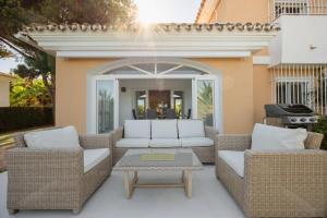 Obiekt Villa in Elviria, a retreat among palm trees, with private pool and barbecue, Marbella, położony w dzielnicy Elviria w miejscowości Marbella, oferuje klimatyzację, balkon oraz widok na basen. Willa oferuje basen, ogród, grill, bezpłatne WiFi oraz parking.