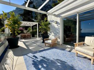 Featuring a private entrance, this air-conditioned villa is comprised of 1 living room, 2 separate bedrooms and 2 bathrooms with a shower and a bidet. The villa's kitchen, which features kitchenware, is available for cooking and storing food. Boasting a terrace with sea views, this villa also offers a washing machine and a flat-screen TV with streaming services. The unit offers 3 beds.