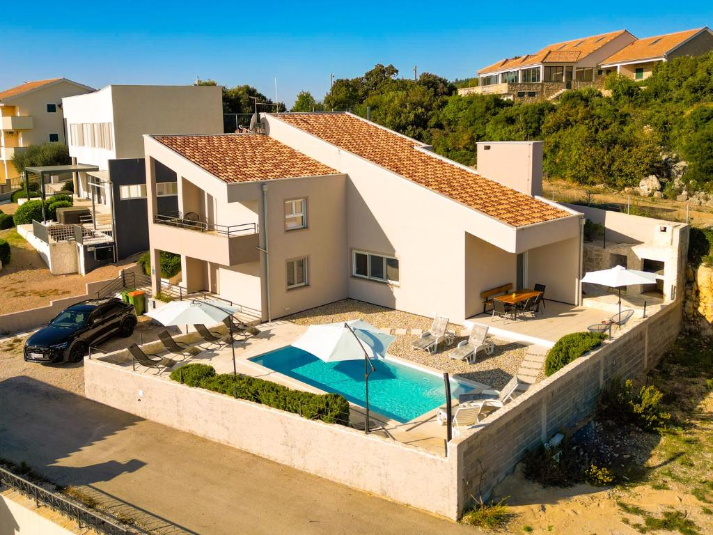 This villa features a pool with a view. Boasting a private entrance, this air-conditioned villa features 1 living room, 4 separate bedrooms and 2 bathrooms with a walk-in shower and a bath. Guests will find a stovetop, a refrigerator, a dishwasher and kitchenware in the well-fitted kitchen. The villa also comes with a barbecue. Featuring a terrace with sea views, this villa also features a washing machine and a flat-screen TV with cable channels. V této ubytovací jednotce se nachází 7 postelí.