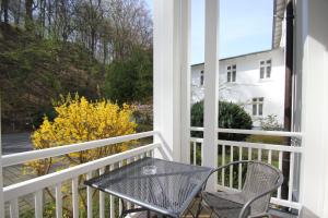 The spacious apartment with a terrace and sea views features 1 bedroom, a living room, a TV, an equipped kitchen with a dishwasher and an oven, and 1 bathroom with a shower. Villa Strandeck FeWo2 - strandnah, Meerblick, Balkon includes an outdoor dining area.