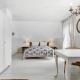Includes a seating area and a kitchenette with a stove, fridge and coffee maker.