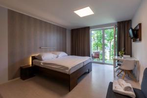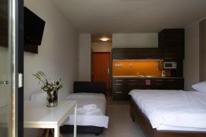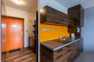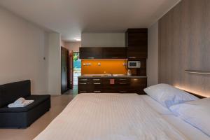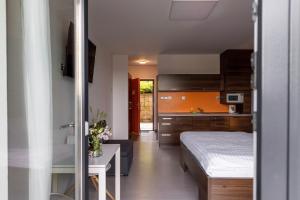This studio with hardwood floors features a fully equipped kitchenette, a seating area, a private bathroom with shower and a furnished balcony with Vranov Dam views.