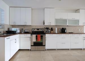Willa Whispering Palms Villa in Jolly Harbour posiada 1 sypialnię, klimatyzację oraz telewizor z płaskim ekranem. Na miejscu znajduje się kuchnia.