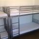 Habitación con 2 camas individuales, taquillas personales y acceso a un baño compartido.