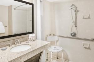 This wheelchair accessible room features a seating area, 40-inch flat-screen TV, chair and refrigerator as well as a microwave and a coffee machine. The en suite also includes: - Removable showerhead wand - Shower chairs available upon request - Granite counter tops