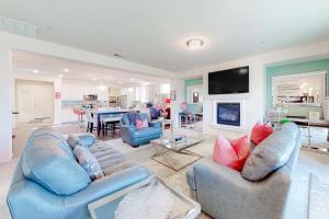 The spacious holiday home has 3 bedrooms, 2 bathrooms, bed linen, towels, a TV with streaming services, a dining area, a fully equipped kitchen, and a patio with mountain views. Wish You Were Here Permit# 50194 also features a seating area and a fireplace.