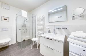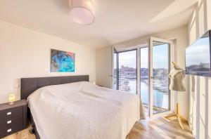 Apartmán má 1 ložnici, 1 koupelnu, ložní prádlo, ručníky, TV, kuchyň s kompletním vybavením a balkon s výhledem na jezero. V koupelně ubytování Wohlfühloase in der Hafenresidenz mit Balkon und Wellness nechybí sprcha ani fén.