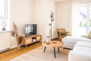 Tento apartmán v Wunderschöne Ferienwohnung mit Feldblick und Balkon, mit kostenlosem Wlan und Strandfahrrad, Haustiere erlaubt má balkon, 1 ložnici, obývací prostor a kuchyň s lednicí a myčkou. Vybavení Wunderschöne Ferienwohnung mit Feldblick und Balkon, mit kostenlosem Wlan und Strandfahrrad, Haustiere erlaubt zahrnuje TV s plochou obrazovkou.