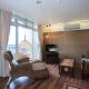 Hosté mohou relaxovat v obývacím pokoji a kochat se výhledem na hory.