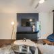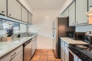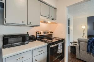 W apartamencie z 1 sypialnią w Your Modern King Suite Getaway - Sleeps 4 - Pool, Prkg znajduje się salon z telewizorem, wyposażona kuchnia z lodówką i zmywarką oraz łazienka z suszarką.